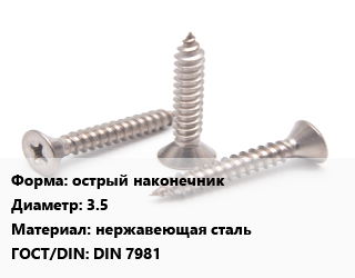 Саморез острый наконечник D=3.5 нержавеющая сталь ГОСТ: DIN 7981, упаковка 15000 шт цена от 6 478 Р / кг, где купить, условия доставки в Гродно и Гродненской области