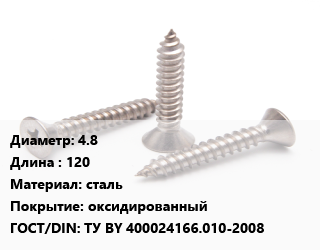 Саморез 4.8 L=120 сталь оксидированный ГОСТ: ТУ BY 400024166.010-2008, упаковка 1000 шт, для дерева, РМЗ цена от 1 629 Р / кг, где купить, условия доставки в Гродно и Гродненской области
