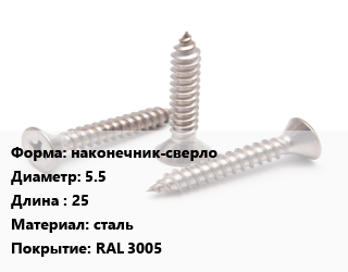 Саморез наконечник-сверло D=5.5 L=25 сталь RAL 3005, упаковка 420 шт цена от 1 233 Р / кг, где купить, условия доставки в Гродно и Гродненской области