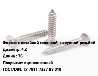 Саморез с потайной головкой, с крупной резьбой D=4.2 L=76 оцинкованный ГОСТ: ТУ 7811-7357 BY 010, кг, для гипсокартона цена от 131.45 Р / кг, где купить, условия доставки в Гродно и Гродненской области