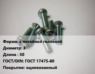 Винт с потайной головкой 3х50 ГОСТ 17475-80 оцинкованный, упаковка 1000 шт, кг цена от 545.46 Р / кг, где купить, условия доставки в Гродно и Гродненской области