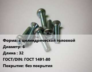 Винт с цилиндрической головкой 6х32 ГОСТ 1491-80 без покрытия, 4.8, кг цена от 102.4 Р / кг, где купить, условия доставки в Гродно и Гродненской области