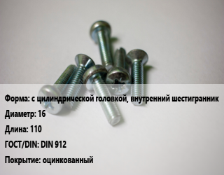 Винт с цилиндрической головкой, внутренний шестигранник 16х110 DIN 912 оцинкованный, 8.8, цена за 1000 шт, кг цена от 132.63 Р / кг, где купить, условия доставки в Гродно и Гродненской области